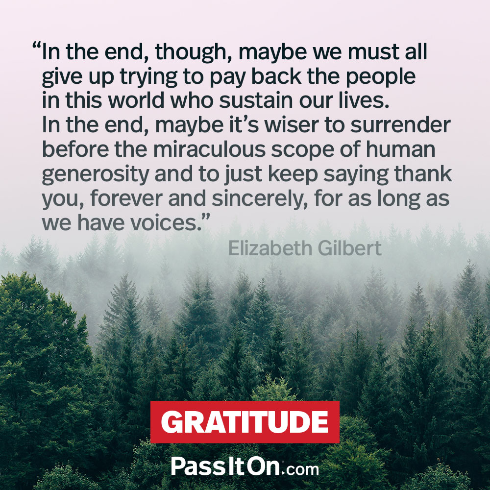 “In the end, though, maybe we must all give up trying to pay back the people in this world who sustain our lives. In the end, maybe it's wiser to surrender before the miraculous scope of human generosity and to just keep saying thank you, forever and sincerely, for as long as we have voices.”